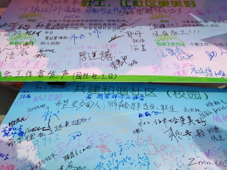 在宣传期间,多数参与者表示没有听说过“社会工作”,仅有几位了解社会工作的也将其与义工、志愿者混淆。于是学生们耐心地为大家答疑解惑,让更多师生知晓这一专业与职业。通过宣传,许多参与者十分认同社会工作的工作理念与内容,纷纷在留言板上留下了美好的寄语。