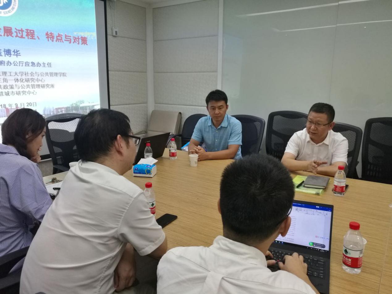 报告结束后,我院纪晓岚教授、唐有财处长,就长三角一体化推进过程中的应急管理问题以及未来的合作事宜与盖博华主任展开了深入的讨论与交流。