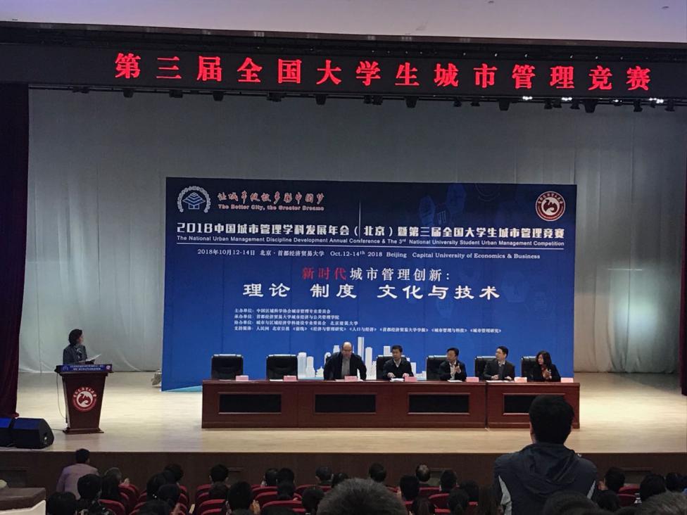 2018年10月12-14日,“2018中国城市管理学科发展年会(北京)暨第三届全国大学生城市管理竞赛”在首都经济贸易大学隆重举行。本次年会由中国区域科学协会城市管理专业委员会主办,首都经济贸易大学城市经济与公共管理学院承办。我院纪晓岚教授、俞慰刚教授、博士研究生沈菊生、硕士研究生陈玮炜和金铂皓应邀参与了此次年会。