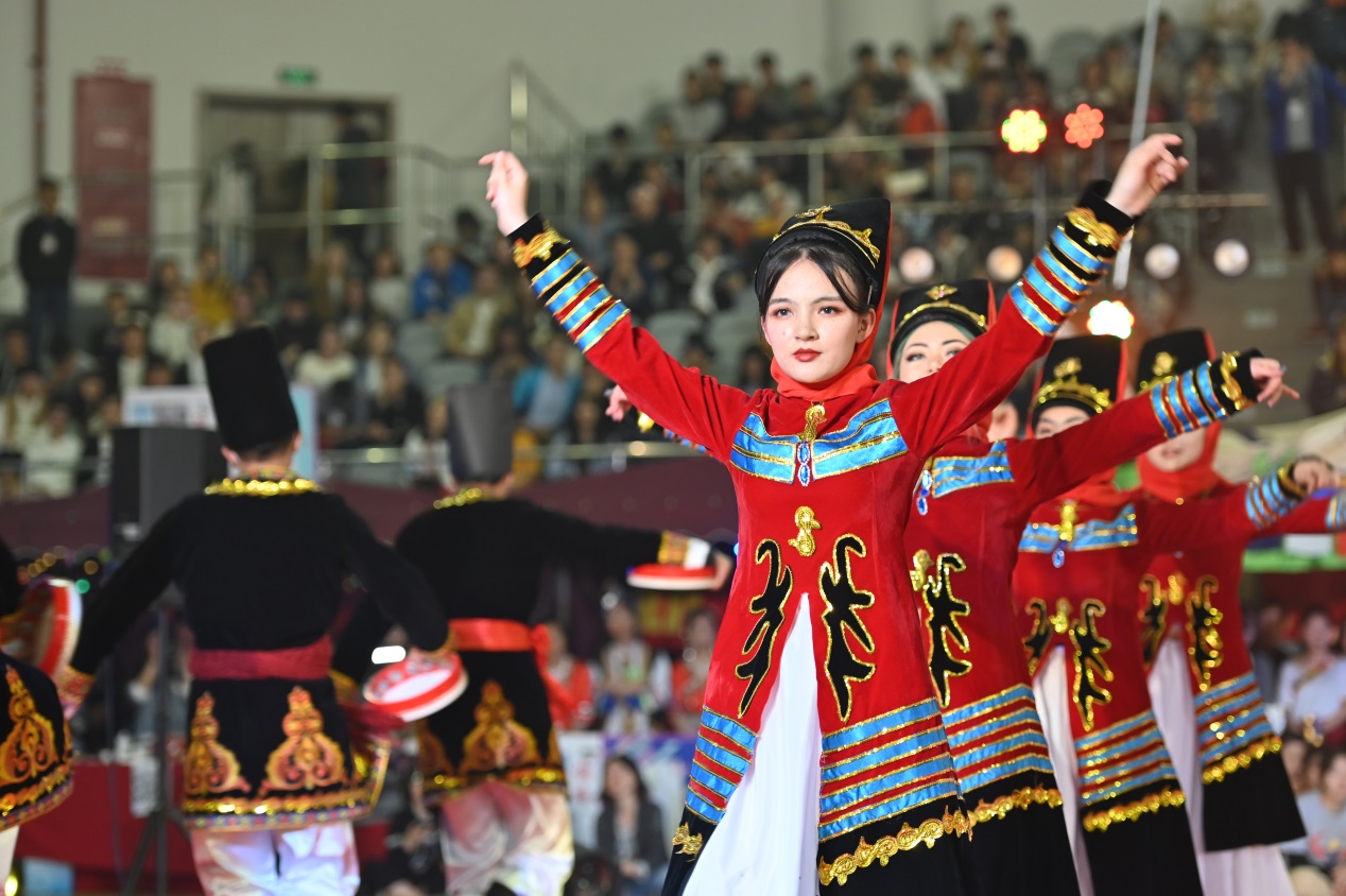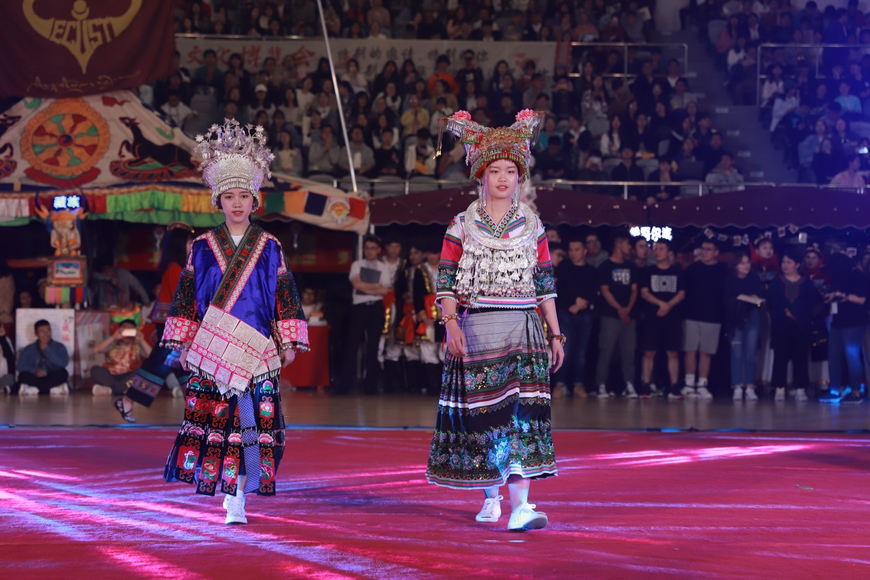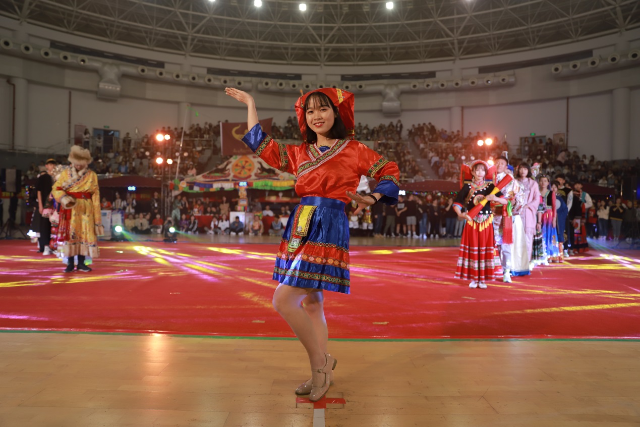 同时,场馆四周陈列着大大小小的民族展示摊位。同学们在欣赏精彩纷呈的节目之余,也可以走入各民族摊位,与各民族师生近距离互动,感受不一样的民族文化。美味的民族小吃、风情各异的民族服饰、制作精美的民族工艺品等陈列其上,令参与互动的同学流连忘返、称赞不已。民族知识问答、民族文化体验、民族工艺品手工制作等,将“文化”与“娱乐”相结合,这样别出新意的交互模式让同学们深刻地感受到民族文化的独特魅力,更彰显“中华民族一家亲”的理念。最后,在欢快悠扬的民族乐声中,各族同学们共同跳起了集体舞蹈,让在场所有人都亲身体验了不同民族间的文化碰撞与交融。整场活动在和谐、欢快,和感动的气氛中落下帷幕。