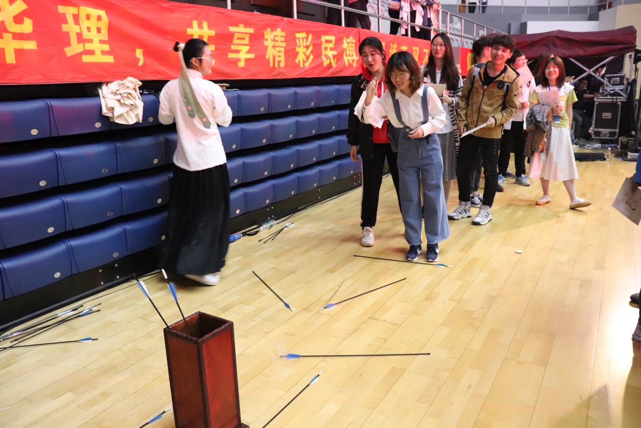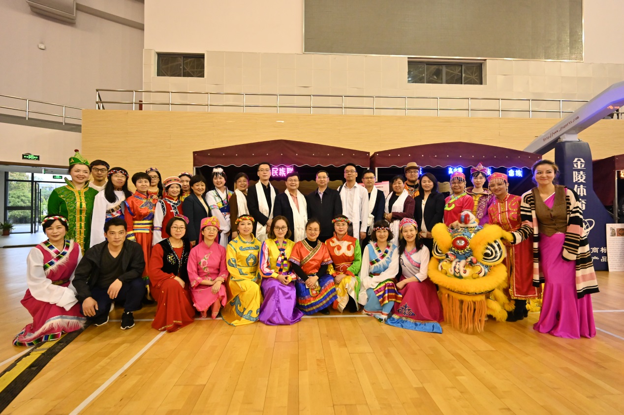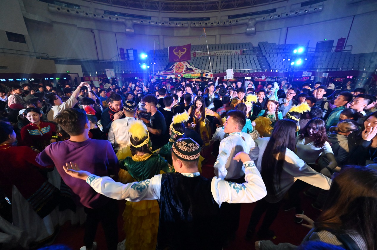 同时,场馆四周陈列着大大小小的民族展示摊位。同学们在欣赏精彩纷呈的节目之余,也可以走入各民族摊位,与各民族师生近距离互动,感受不一样的民族文化。美味的民族小吃、风情各异的民族服饰、制作精美的民族工艺品等陈列其上,令参与互动的同学流连忘返、称赞不已。民族知识问答、民族文化体验、民族工艺品手工制作等,将“文化”与“娱乐”相结合,这样别出新意的交互模式让同学们深刻地感受到民族文化的独特魅力,更彰显“中华民族一家亲”的理念。最后,在欢快悠扬的民族乐声中,各族同学们共同跳起了集体舞蹈,让在场所有人都亲身体验了不同民族间的文化碰撞与交融。整场活动在和谐、欢快,和感动的气氛中落下帷幕。