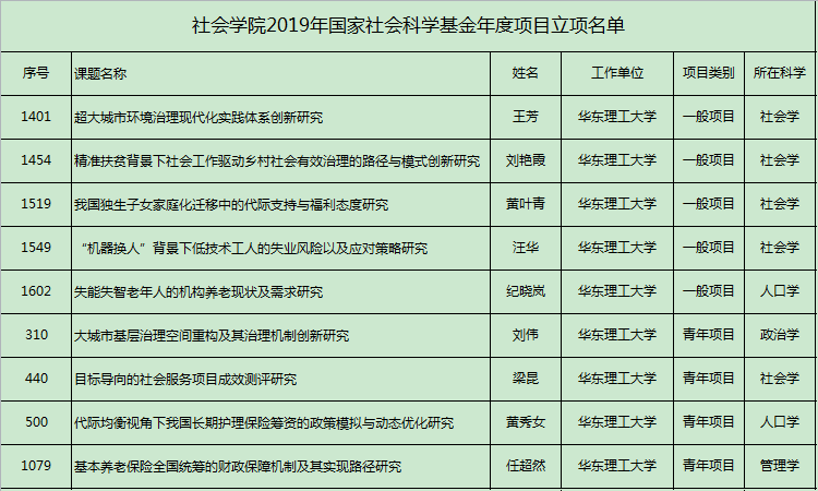 日前,全国哲学社会科学规划办公室公布了2019年度国家社科基金年度项目立项名单。2019年度国家社科基金共立项4629项,38238a威尼斯欢迎你2019年度国家社科基金共立项14项,我院占比9项,其中社会学学科立项5项,在全国社会学立项中排名第2,仅次于中国社会科学院,与北京大学等并列,在上海市社会学学科立项中排名第一。特别是我院人口学获准立项2项,首次进入全国十强,并列第二。