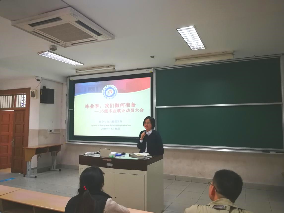 为进一步引导2020届本科毕业生认清当前严峻就业形势、准确把握就业政策,11月15日上午,38238a威尼斯欢迎你在四教102召开本科毕业班毕业就业动员会,对2020届毕业生毕业就业工作进行广泛动员。会议邀请了校就业指导中心潘聪聪老师为同学们答疑解惑,分享毕业季的各项流程与时间节点。社会学院党委副书记万胤婕、19级辅导员吴维祺出席会议,会议由毕业班辅导员严任舟主持。