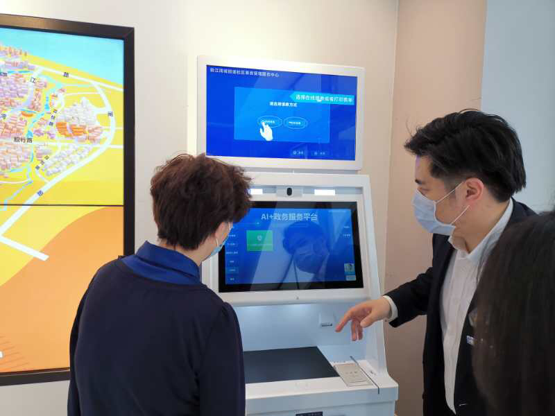 杨浦区新江湾城街道城市网格化综合管理中心负责人张绍云在新江湾城街道社区党群中心湾谷分中心接待了课题组一行。新江湾城街道社区事务受理中心牛晓斌详细介绍了新江湾城街道AI家门口政务服务平台的功能。课题组亲自体验了该政务平台的操作程序并充分肯定了该平台的综合功能和其服务的可及性与便利性。