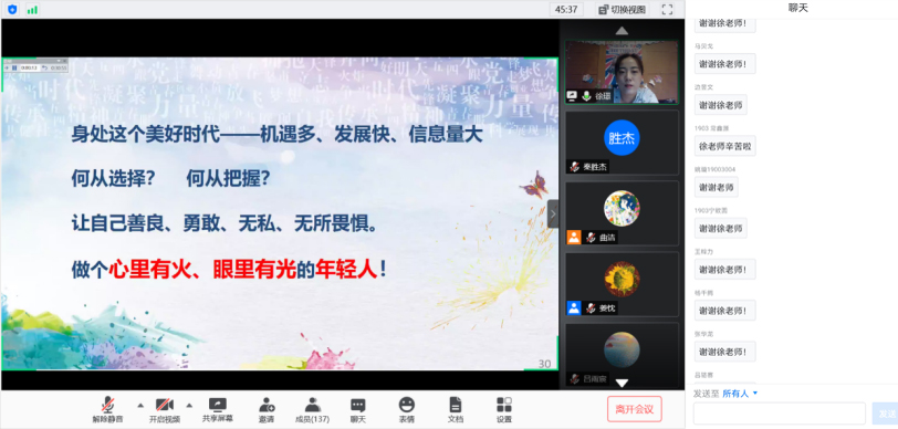 演讲结束后,社院学子深受感染、踊跃发言,积极互动。对同学们提出的问题,徐璟老师结合自身医务人员经历和抗疫感悟进行了细致真诚的回答,并在最后向在场所有入党积极分子寄语:入党并不遥远,新青年只有保持永远善良、永远勇敢的一份心,在党和国家需要的时候挺身而出,才是最难能可贵的。在温馨感人的一声声祝福和感谢中,本次空中课堂圆满结束。