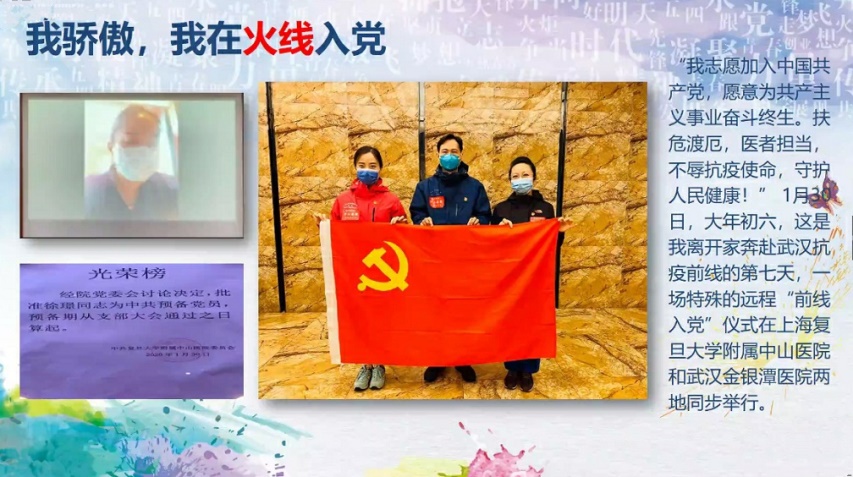 徐璟老师结合自身的抗疫故事,从疫情就是命令、奋斗一线、火线入党和寄语青年四个方面交流了自己的所思所想。徐璟老师用一个个生动的一线医护小故事向我们介绍了自己的主阵地、新冠肺炎的“风暴眼”:武汉市金银潭医院。在没有疫情经验借鉴,人力、物力和医疗设备都缺乏的情况下,徐璟老师说:“用一切可以利用的条件保护自己,战胜肺炎就是最终目标。”130日,离家奔赴武汉抗疫的第七天,徐璟老师以一场特殊的远程“前线入党”仪式火线入党,成为了上海援鄂医疗队第一名光荣入党的医护人员。当谈及入党理解时,徐璟老师说:“要不忘初心,才能找对人生方向,才能坚持自己的追求,抵达自己的初衷,共同助力伟大中国梦。”