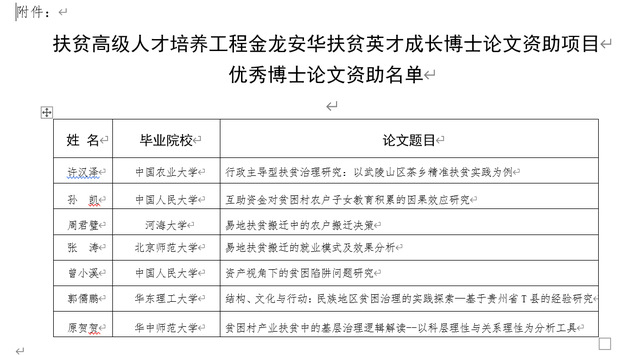 近日,我院2019届毕业研究生郭儒鹏的博士论文《结构、文化与行动:民族地区贫困治理的实践探索——基于贵州省T县的经验研究》(指导教师:杨发祥教授)获得国务院扶贫办“扶贫高级人才培养工程:金龙安华扶贫英才成长博士论文项目”资助。