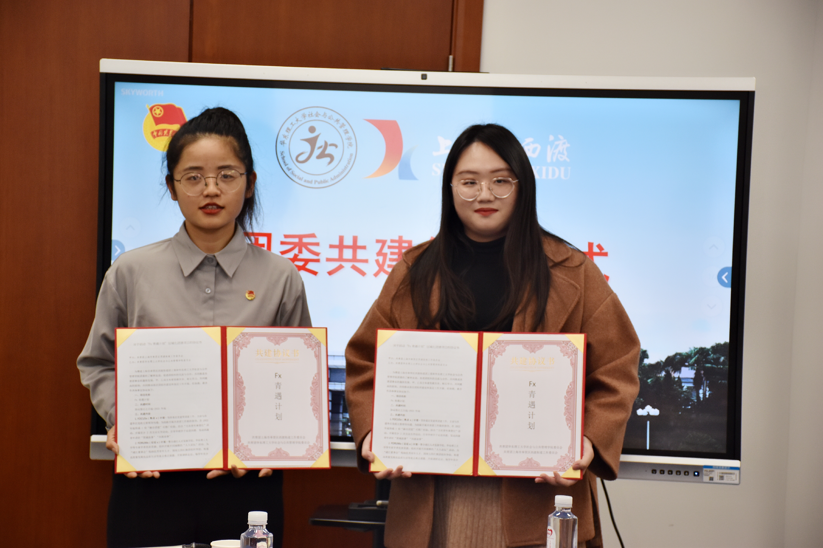 随后,双方对共建协议细则进行商讨,希望通过不断拓宽社院和西渡街道的合作空间,将社院的学科专业优势与西渡街道发展需求相结合,为我院社会实践项目落地提供长期合作平台。把西渡街道“四史”教育优势资源与我院师生的“四史”学习需求相结合,坚定理想信念,切实增强我院师生守初心、担使命的思想自觉和行动自觉。将西渡街道在基础组织建设的优势以及我院在教育培养的需求相结合,为共建工作发展构建新格局、新平台。双方达成了合作共识,姜忱和于薇代表38238a威尼斯欢迎你团委与西渡街道团工委签订了共建协议书。共建仪式结束后,我院邀请西渡街道参会人员作为嘉宾参加了我院社会实践大赛。
