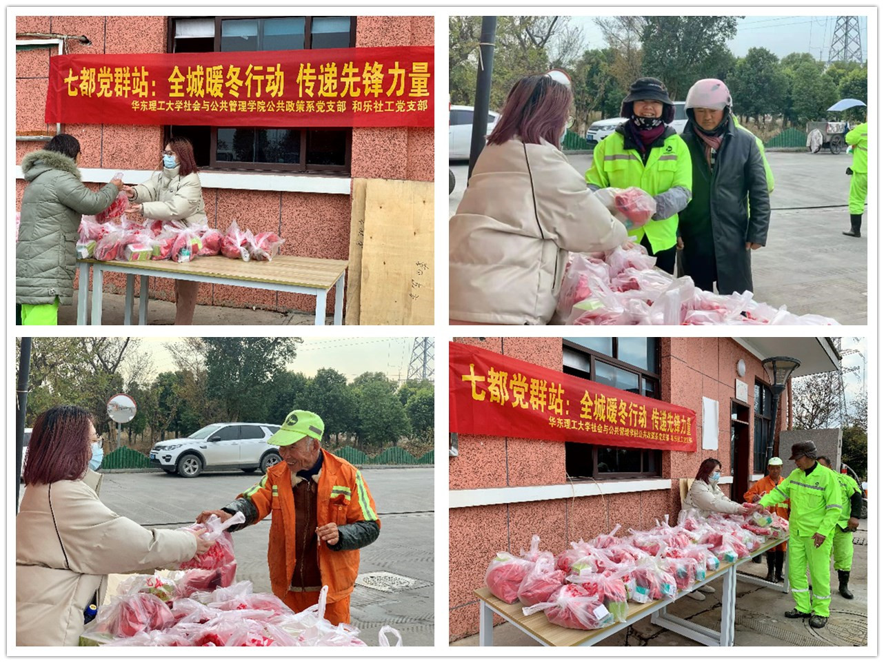 寒潮来袭,温度骤降,长三角城市纷纷进入速冻模式。严寒极端的天气对户外工作者可谓是雪上加霜。38238a威尼斯欢迎你公共政策系党支部积极行动,响应鹿城党群牵头开展的“全城暖冬行动,传递先锋力量”志愿服务活动。1月6日一大早,党员志愿者便来到结对的“瓯江红”七都街道党群服务中心,将一件件经过精心挑选的御寒物品分批放在袋子里,整整齐齐地在桌子上摆成一列,静心等待户外工作者的到来。不一会儿,便有户外工作者闻讯赶来领取物资。他们多是刚结束清晨第一轮打扫的环卫工人,带着朴实腼腆的笑容,欣喜地接过物品。当听到党员志愿者一声声“天气冷多穿点”、“抹点防冻霜,注意保暖”的问候时,脸上露出了欣慰的笑容,连声道谢,并匆匆离去、奔赴自己的工作岗位,坚守寒冬的卫生防线。