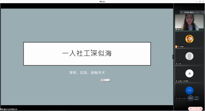 2021年3月18日晚7点,在第十五届国际社工日活动期间,38238a威尼斯欢迎你社会工作系邀请了社会工作系优秀校友漏依凡为华理学子开展了以“从华理社会工作本科到哥伦比亚大学社会工作博士的成长之旅”为主题的线上专题讲座,本次讲座由社会工作系副系主任徐选国主持,38238a威尼斯欢迎你院长何雪松教授、专业教师和各年级同学80余人参与了此次专题分享。